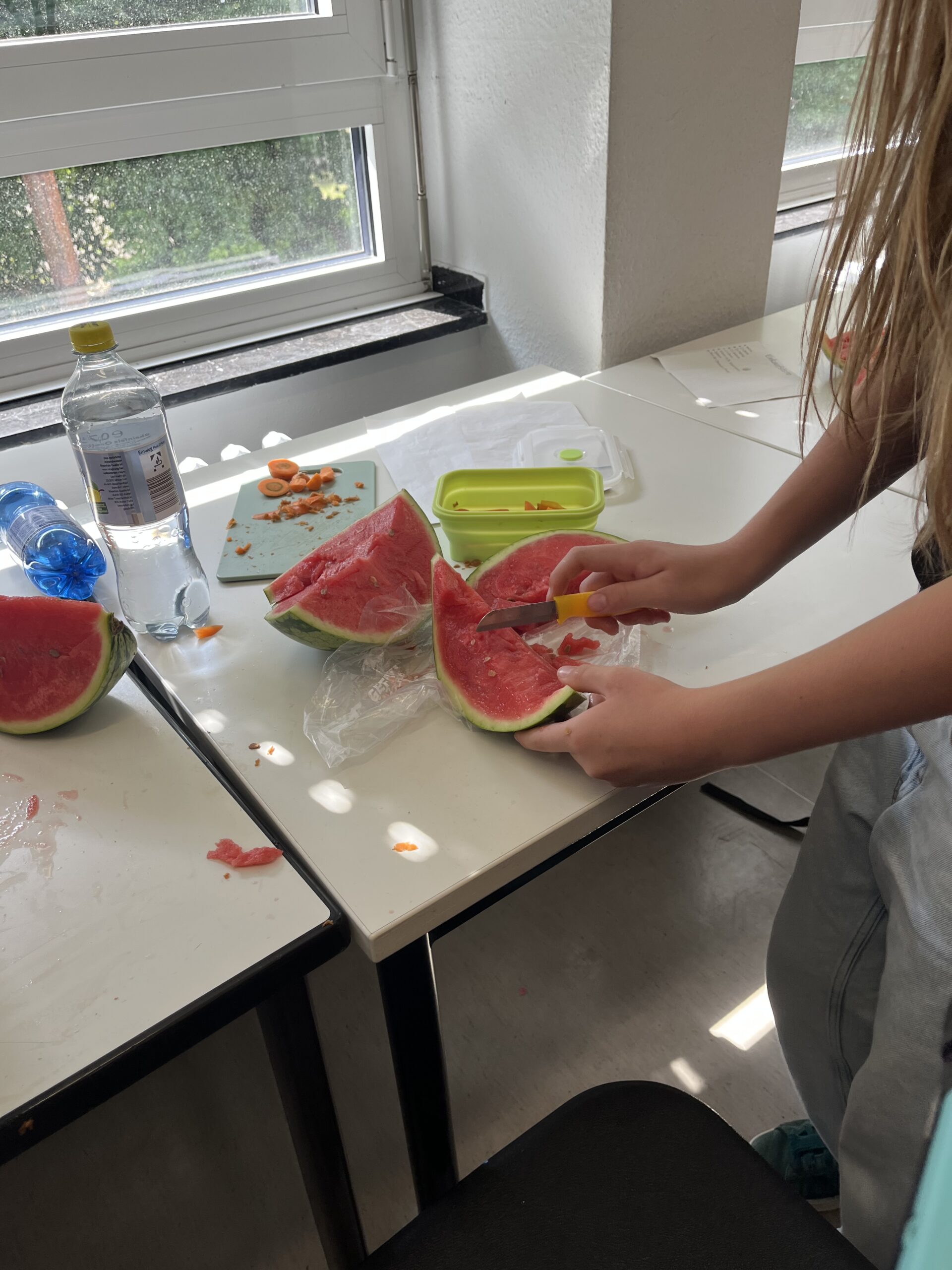 Wir haben geguckt wie viele Zuckerwürfel in einer Colaflasche drinne sind und wir haben uns auch mit Apfelsaft beschäftigt also wie viel Zucker drinne ist. Heute waren wir auch einkaufen und haben gesunde Sachen gekauft die auf der Liste standen und wir haben noch gekocht und einen Obstsalat gemacht.